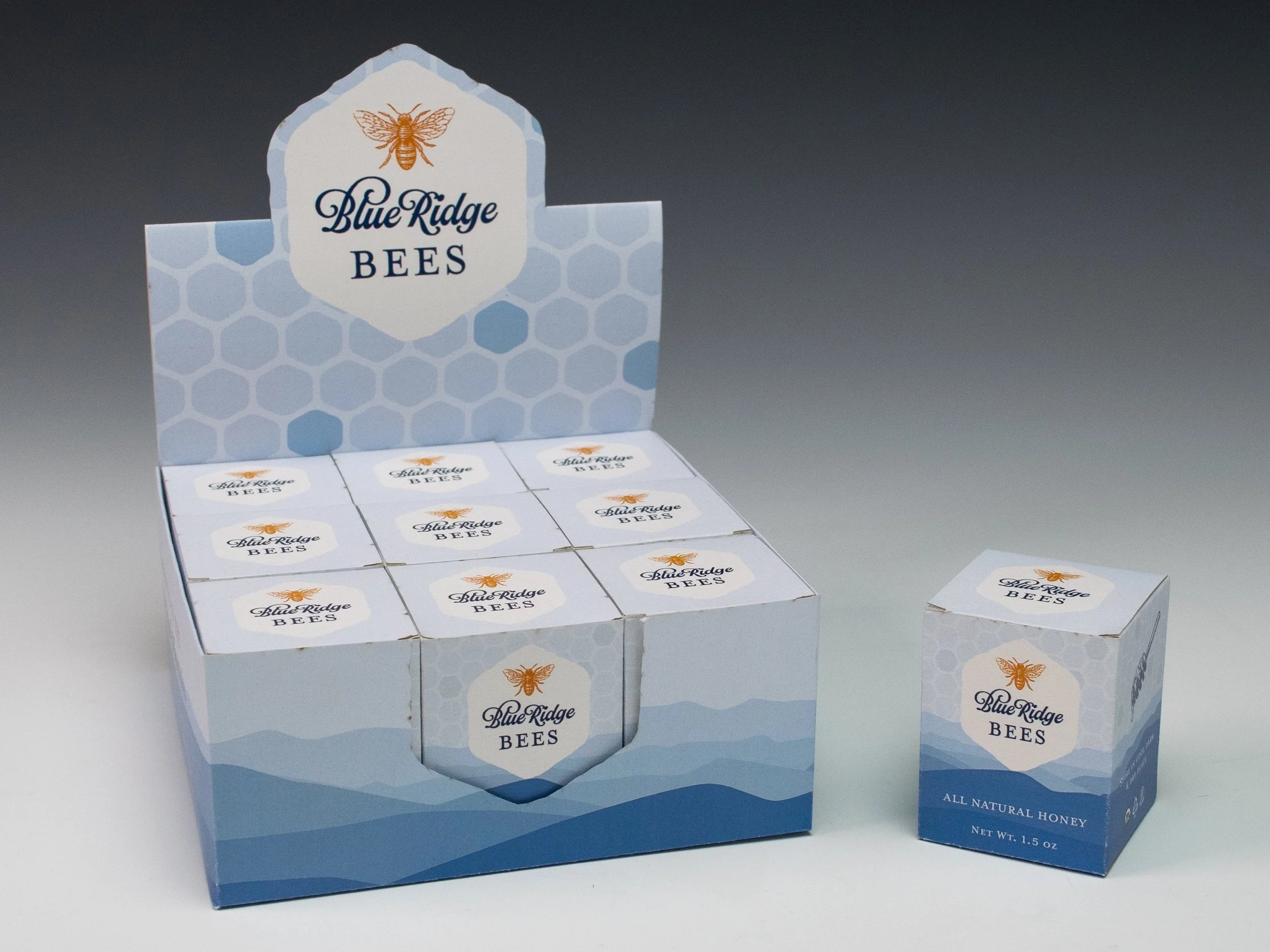 Blue Ridge Bees is a fabricated honey brand inspired by the vibrancy of Western North Carolina and the Appalachian mountains. For this project, I developed the brand and created packaging dielines and designs for honey jar boxes and point-of-sale displays. The product package dieline was manipulated perfectly to fit the honey jar and snugly be arranged in the point of sale box for shipping. To produce the project, I performed print tests to ensure color accuracy and laser-cut the dieline.